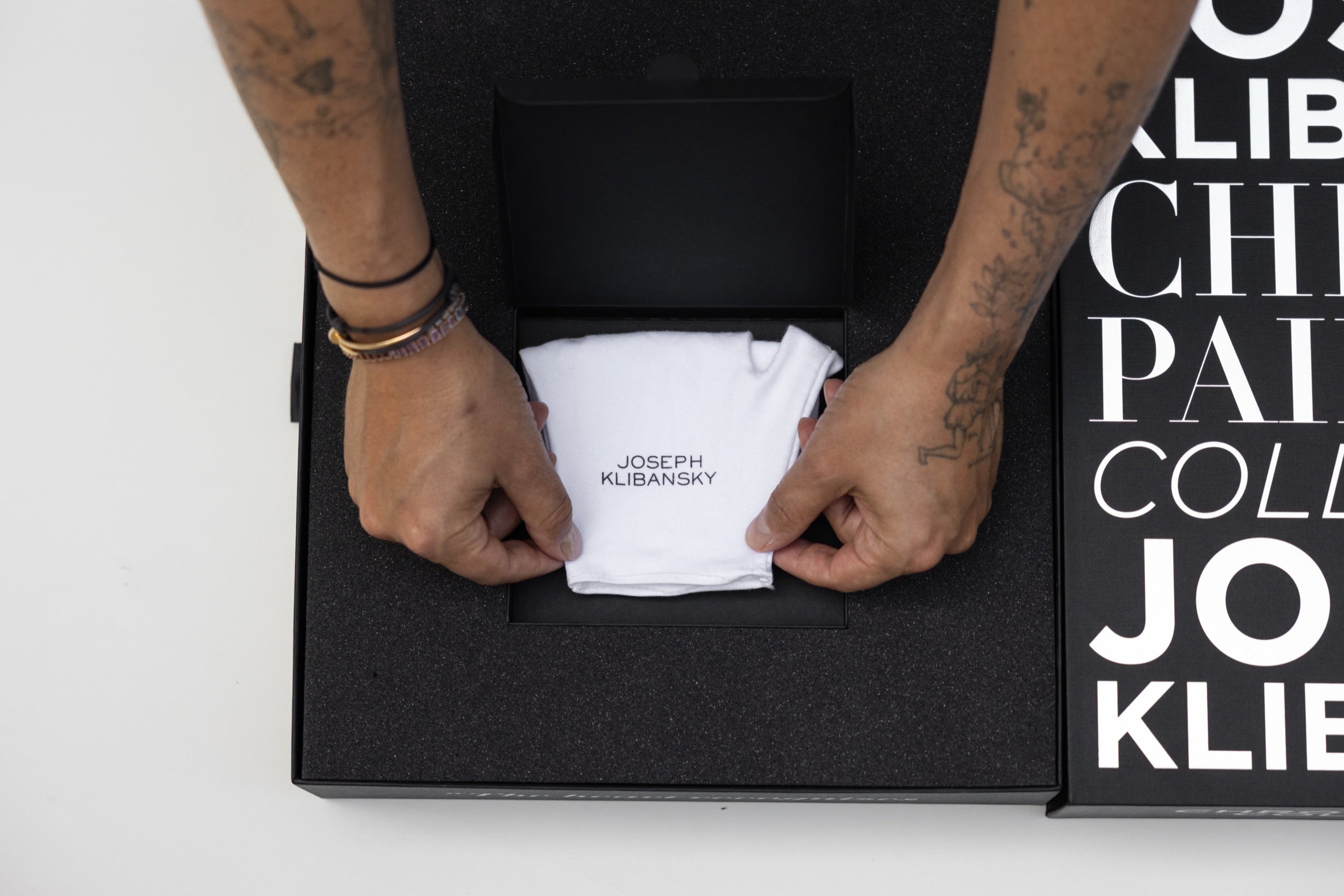 Your artwork arrives in a bespoke box featuring linen textured black paper and chrome colored foil blocking. Unveil your masterpiece with style.