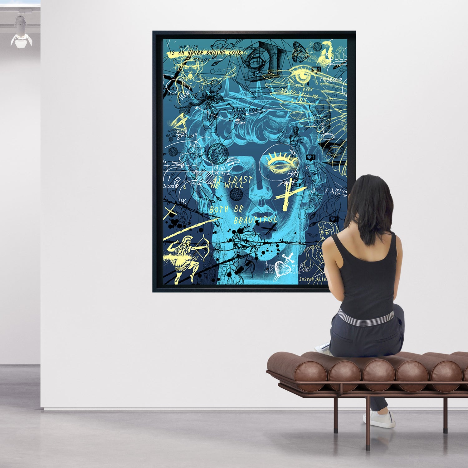Float-mounted behind museum quality anti-glare glass, Never Ending Love is framed in a beautiful black, wooden block-frame with an aluminum strip for easy hanging.
