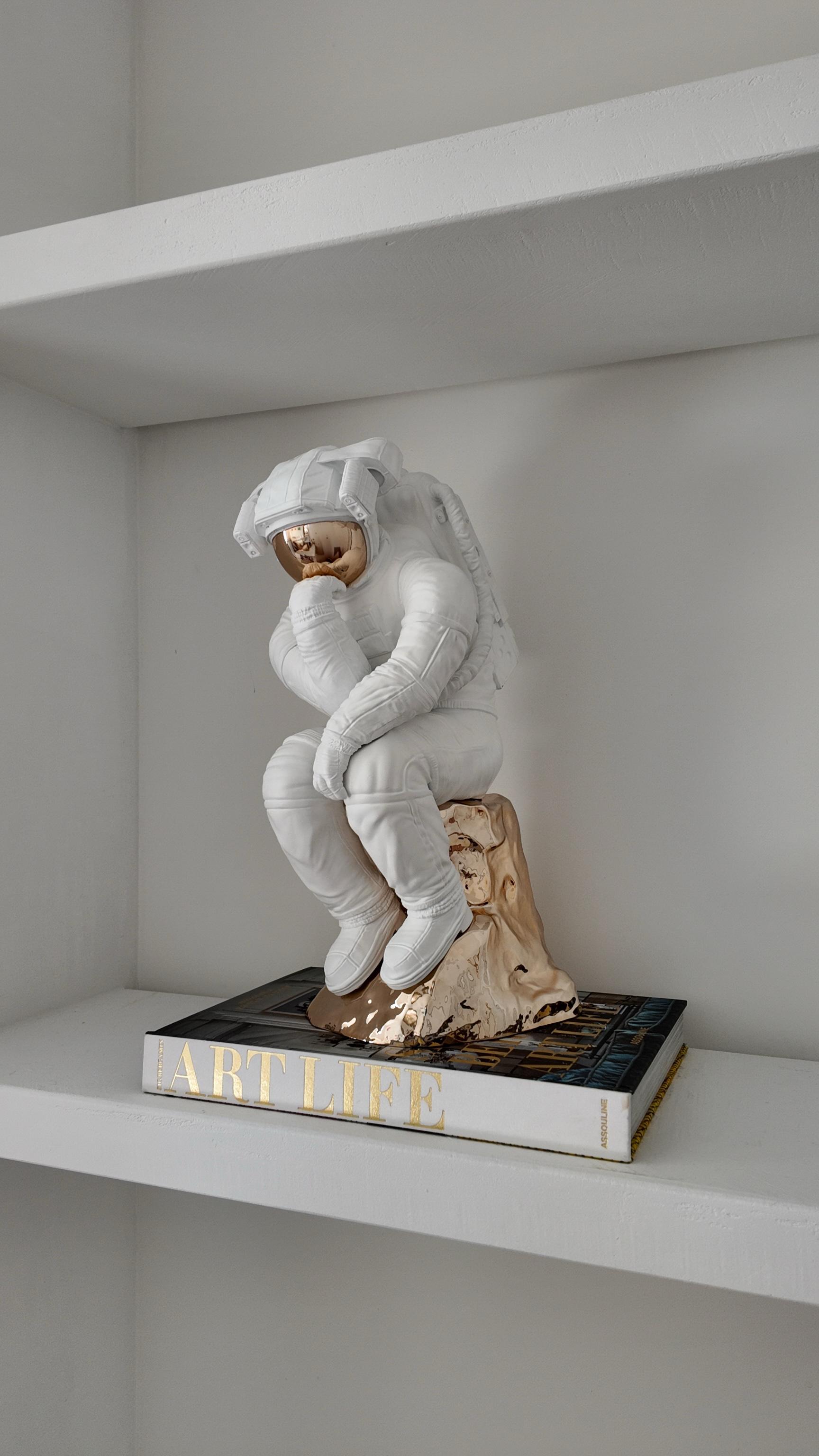 An astronaut sits—frozen in the iconic pose of Rodin’s The Thinker—the rock symbolizing the edge of a new era.