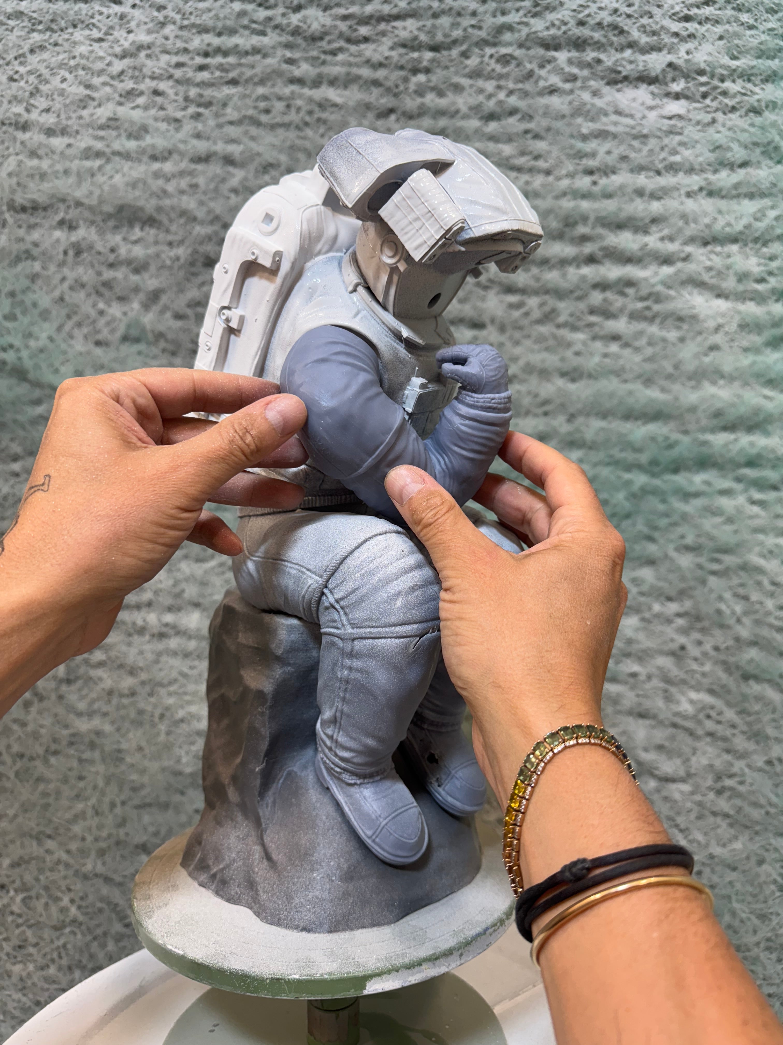 Where Rodin’s sculpture embodied classical philosophy and introspection, this Thinker reflects in the age of artificial intelligence, space exploration, and rapidly shifting ground beneath our feet. Surrounded by the vast unknowns of both cosmos and code, this figure contemplates a different kind of existence—one shaped not only by human reason, but by machines, data, and exponential discovery.