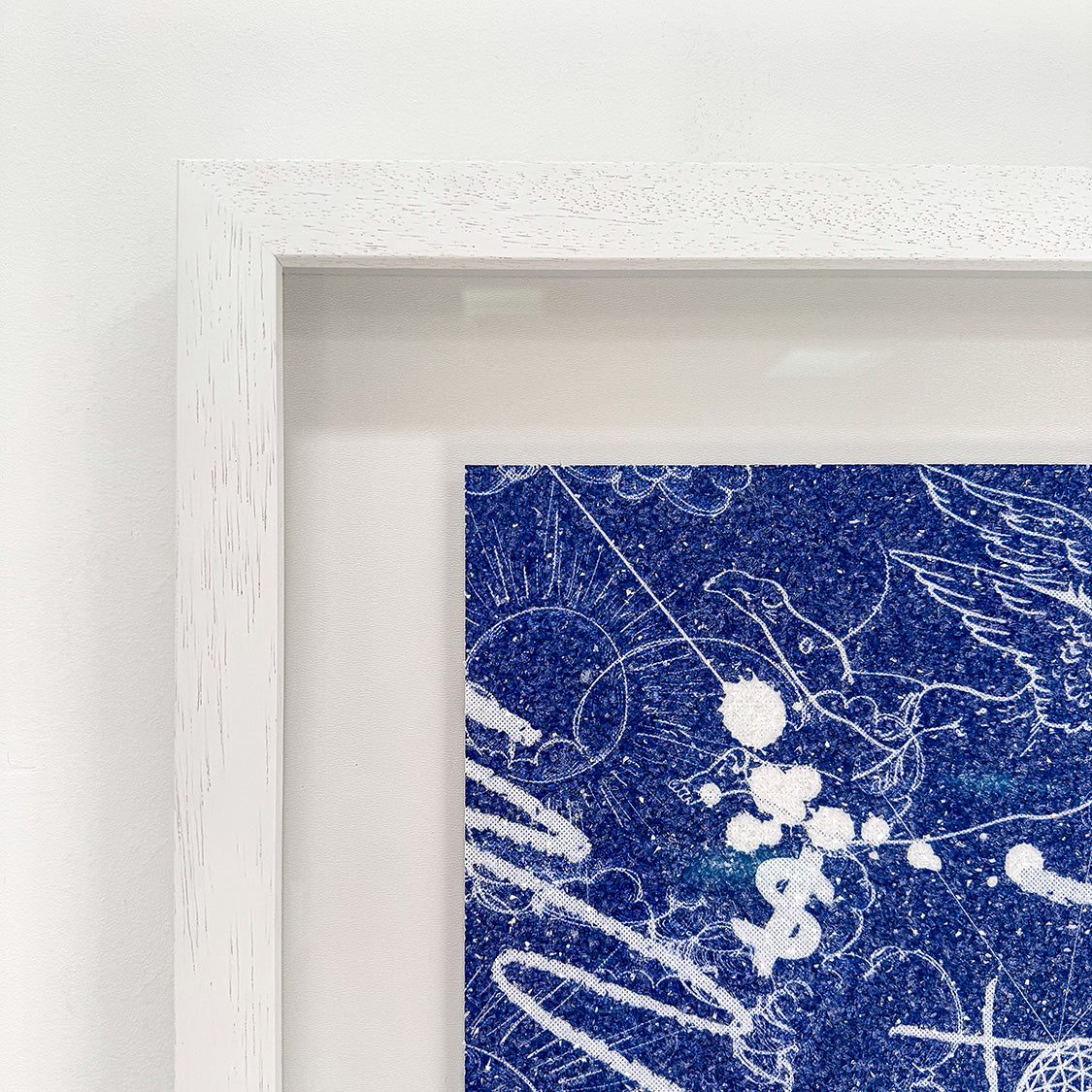 The artwork is a Giclée print on archival fine art paper, set within a white wooden frame measuring 108 x 89 cm. Each artwork is hand-signed by the artist and numbered on the front. The edition size of each print is limited to 100 (plus 20 APs). Villains in my Head - Ultramarine, Diamond Dust is priced at EUR 2,500.