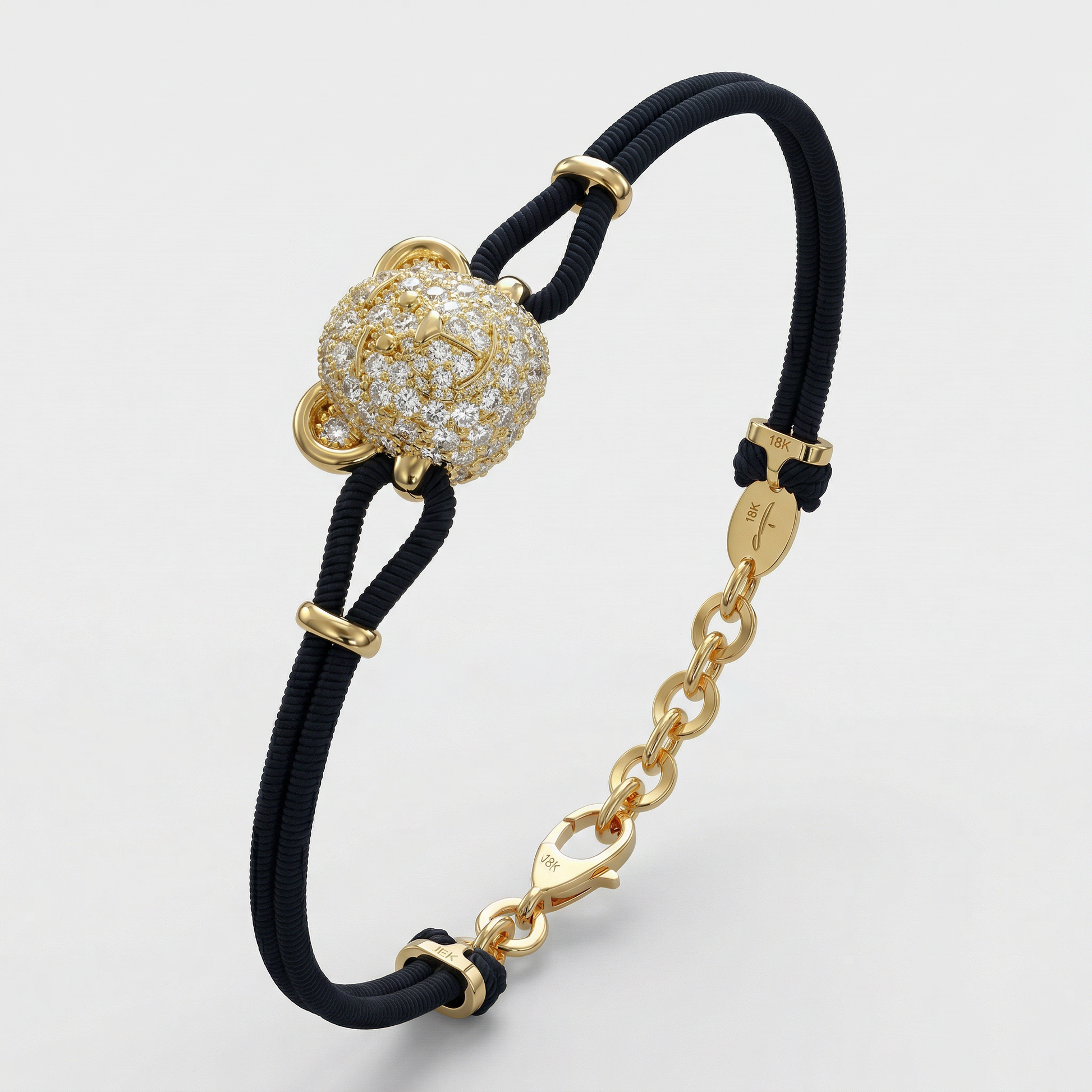 Suspended between double black cords, the radiant diamond bear contrasts beautifully with the minimal construction, resulting in a bold yet effortlessly wearable statement.