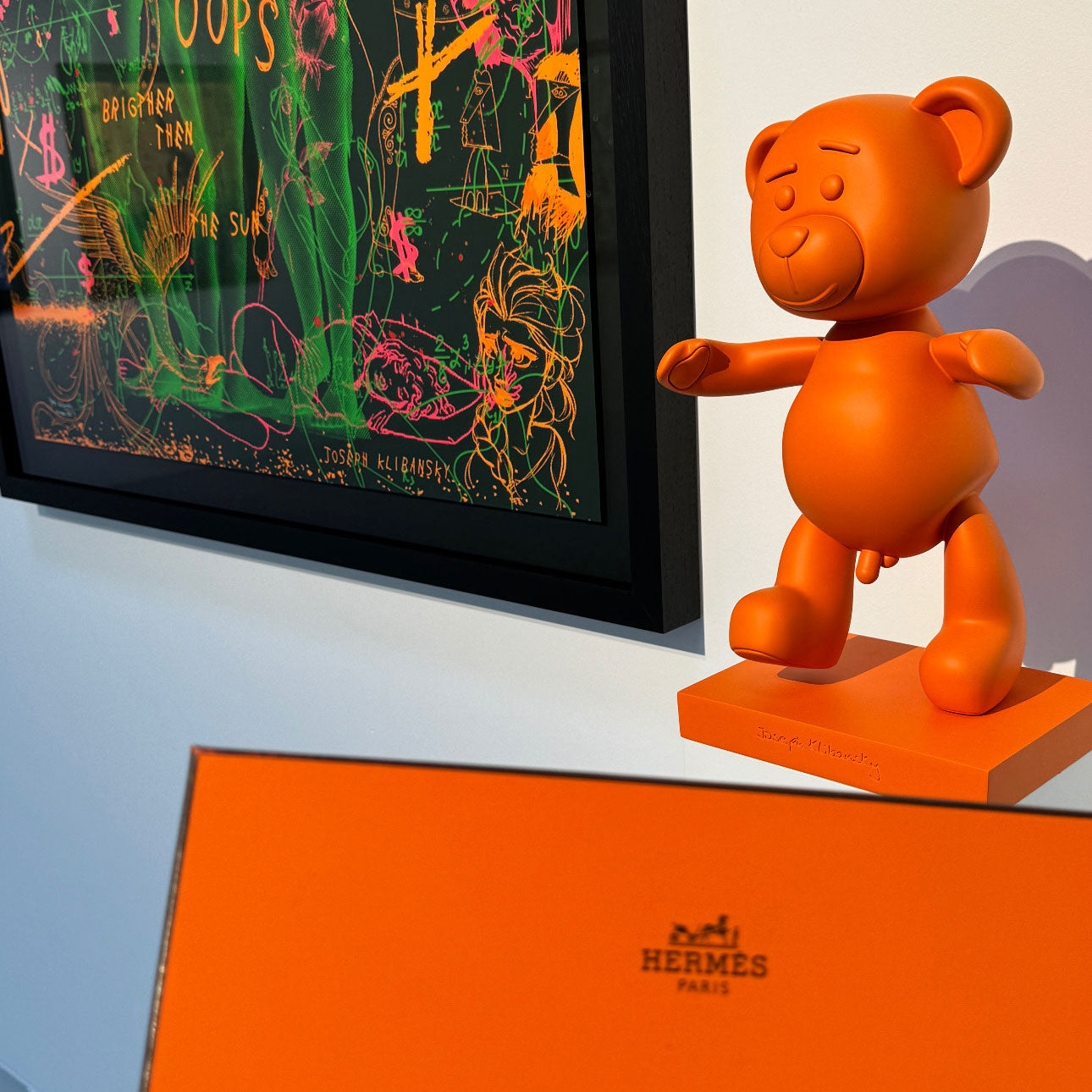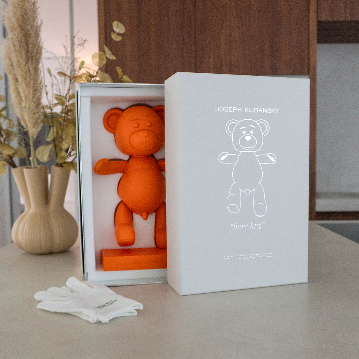 The box is wrapped in a special fine linen paper with an embossing of one of Klibansky's thought paintings, all over. The bear is printed in a reflective foil on the outside, and lays protected in a custom bed of foam on the inside.