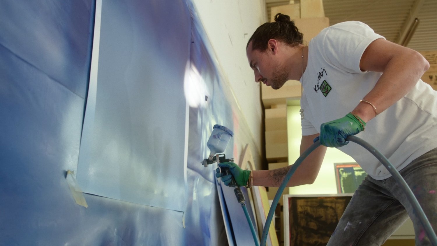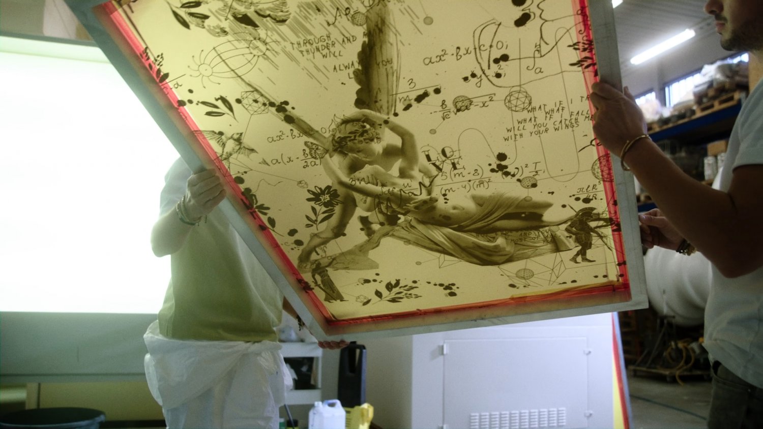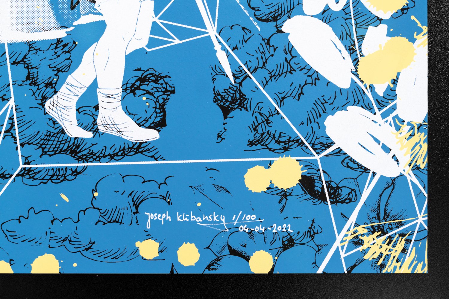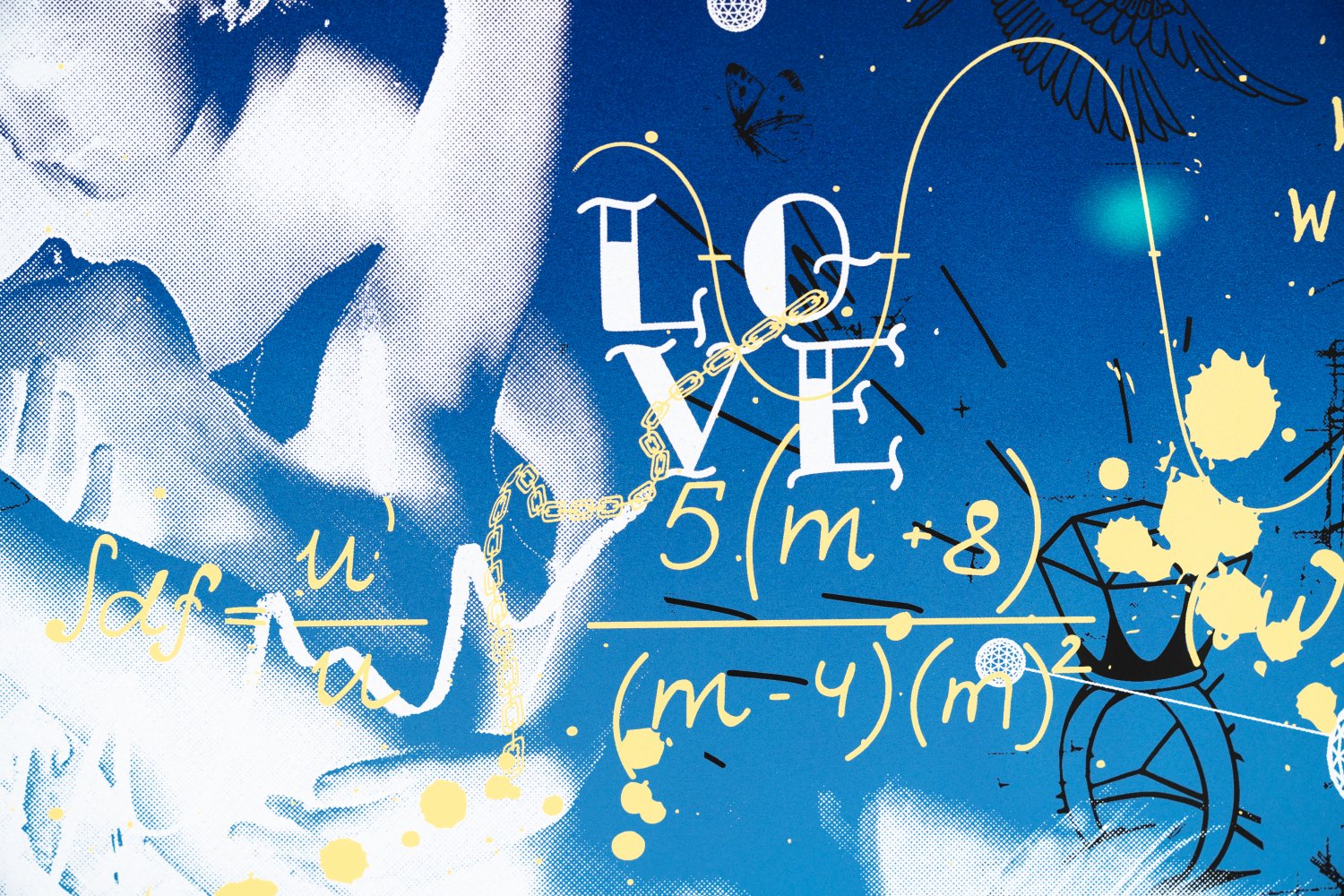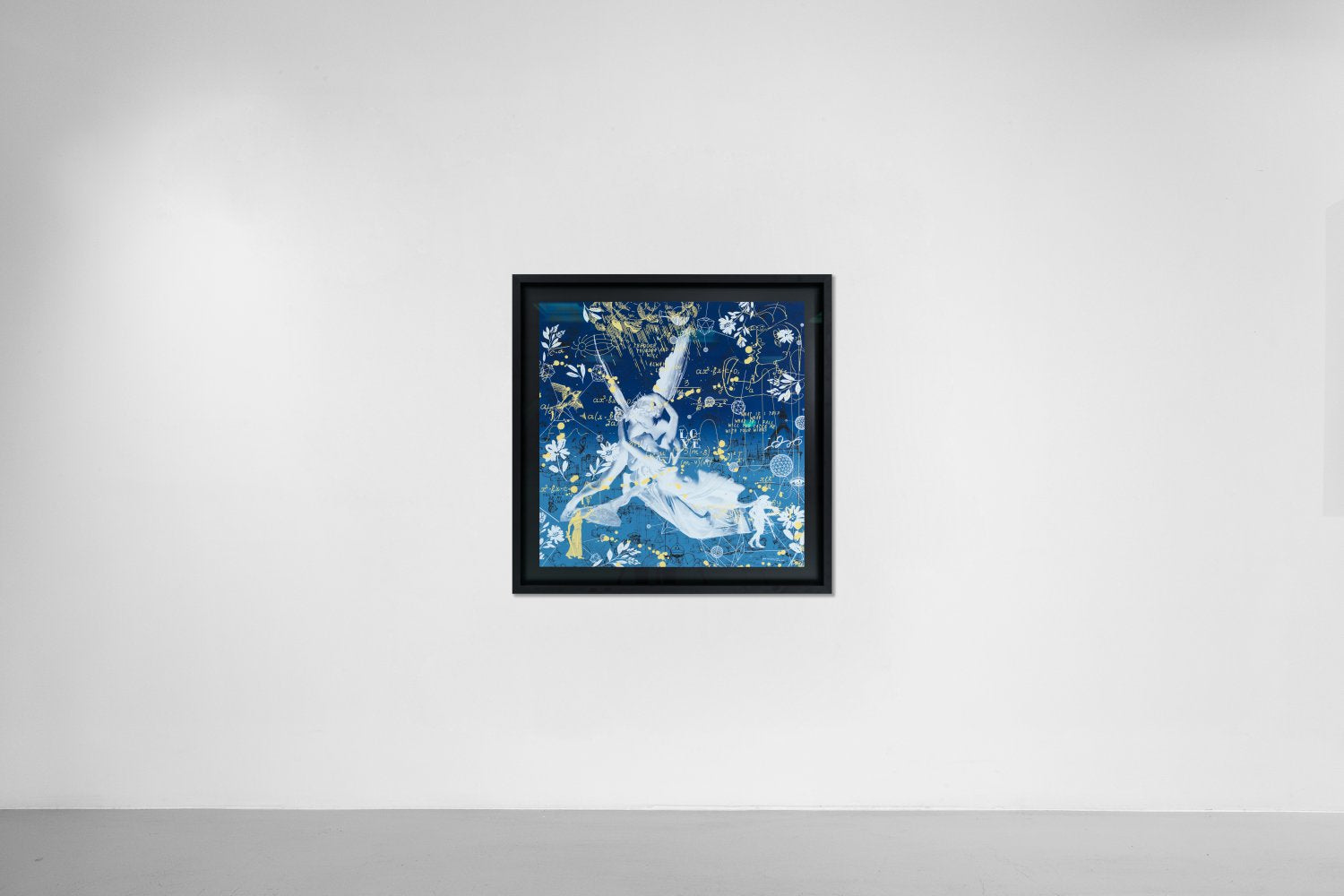 Cupid’s Kiss - Starry Night (blue, edition), 2022 is a Edition from the "Blueprints of Thought" series by the contemporary artist Joseph Klibansky. It's made from the materials acrylic paint, archival cotton paper, museum glass, screen print ink, wood and aluminum frame. And it's created as a limited edition.