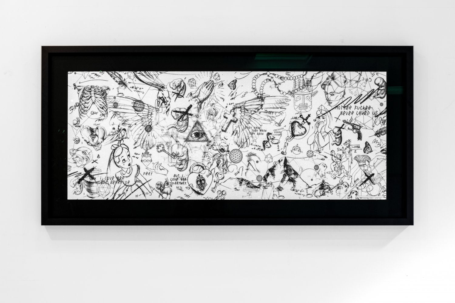 Guided by Angels (edition, white/black, diamond dust), 2020 is a Edition from the "Blueprints of Thought" series by the contemporary artist Joseph Klibansky. It's made from the materials archival cotton paper, diamond dust, museum glass, screen print ink, wood and aluminum frame. And it's created as a limited edition.