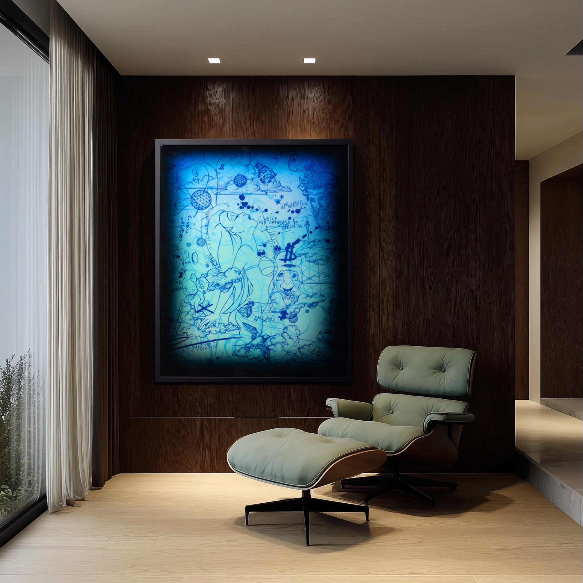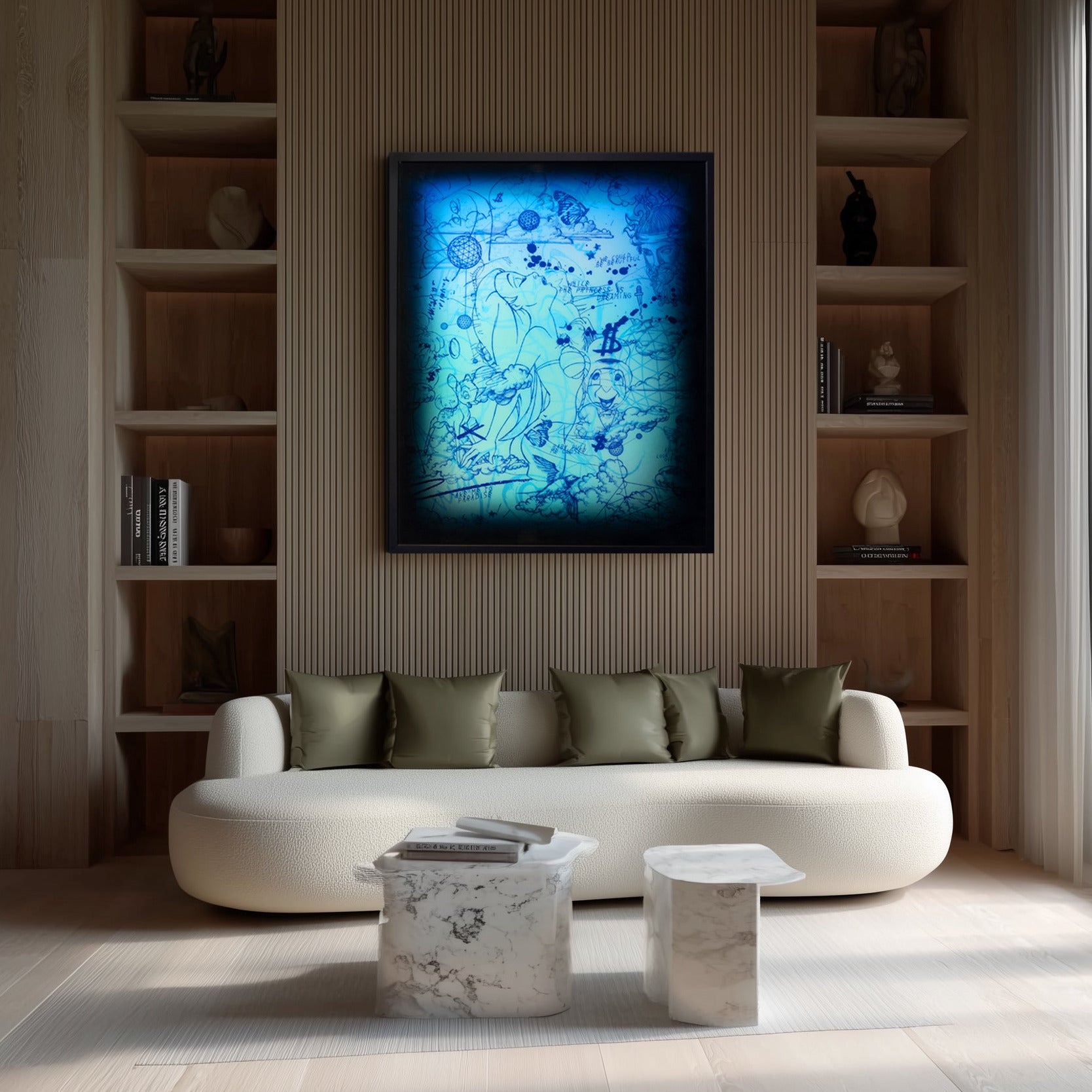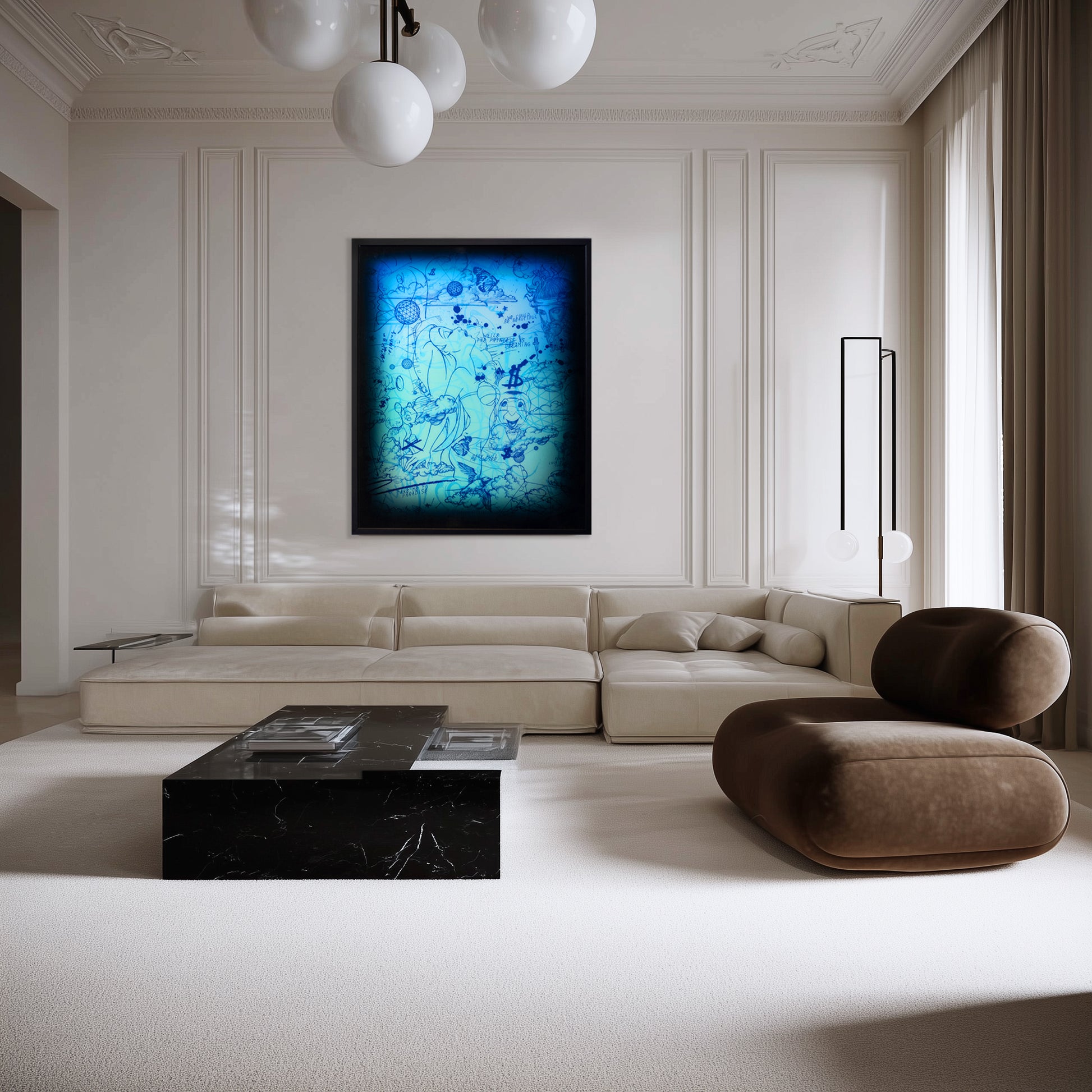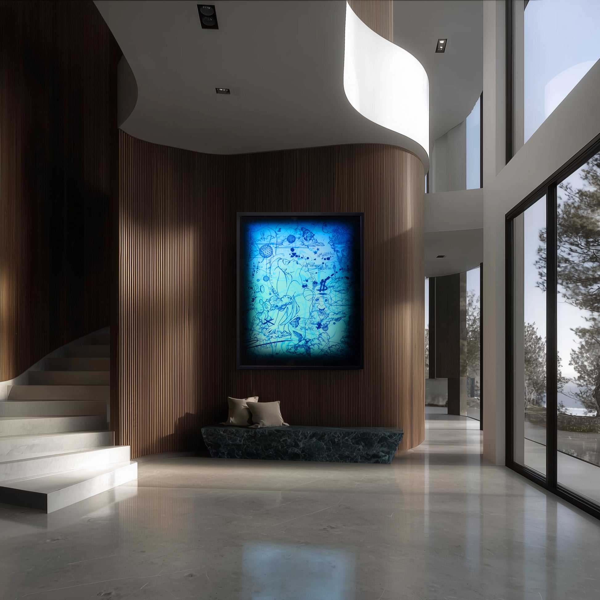 The Radiant Series builds on this by giving the originals a fresh burst of color. In reworking them, [Artist's Name] adds a vibrant depth, with bold colors glowing from the center like sparks in a fading sky. "Still, I Drift" captures the deep silence of an ocean-like subconscious: rich blues flow inward, their soft, dreamlike movement hinting at a slow dive into thought, where broken shapes drift freely, carrying the light, weightless sadness of endless seas. But the edges fade into a dark frame—a vignetting effect that echoes the moody borders of Mark Rothko's color fields, those heavy zones where light gives way to shadow. This isn't copying Rothko; it's an echo of his style. The darkness highlights the inner glow as a brief moment of insight, narrowing the blue's vastness into a growing emptiness that reflects life's inevitable pull toward disorder.