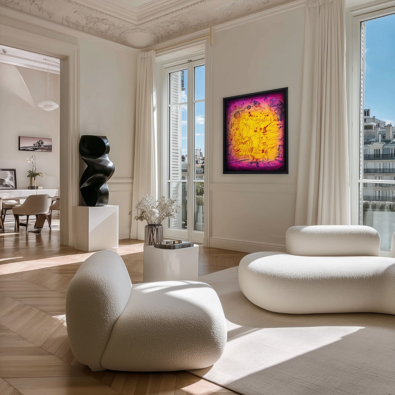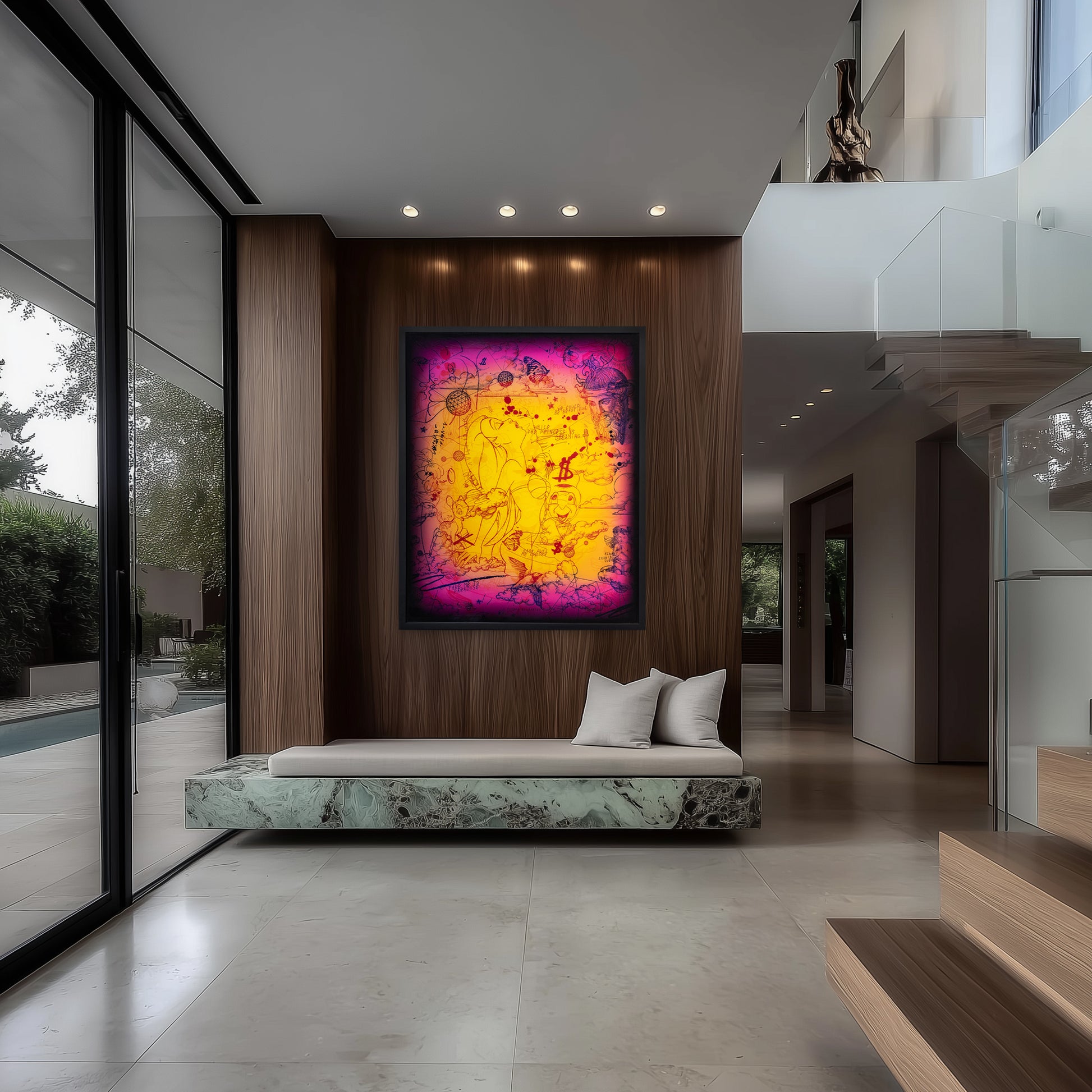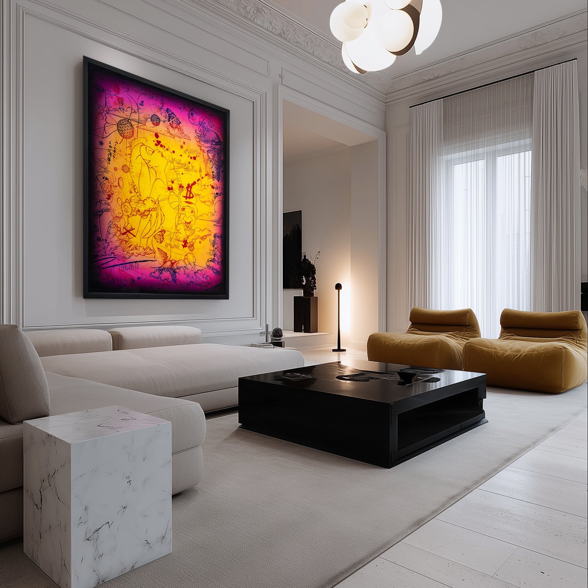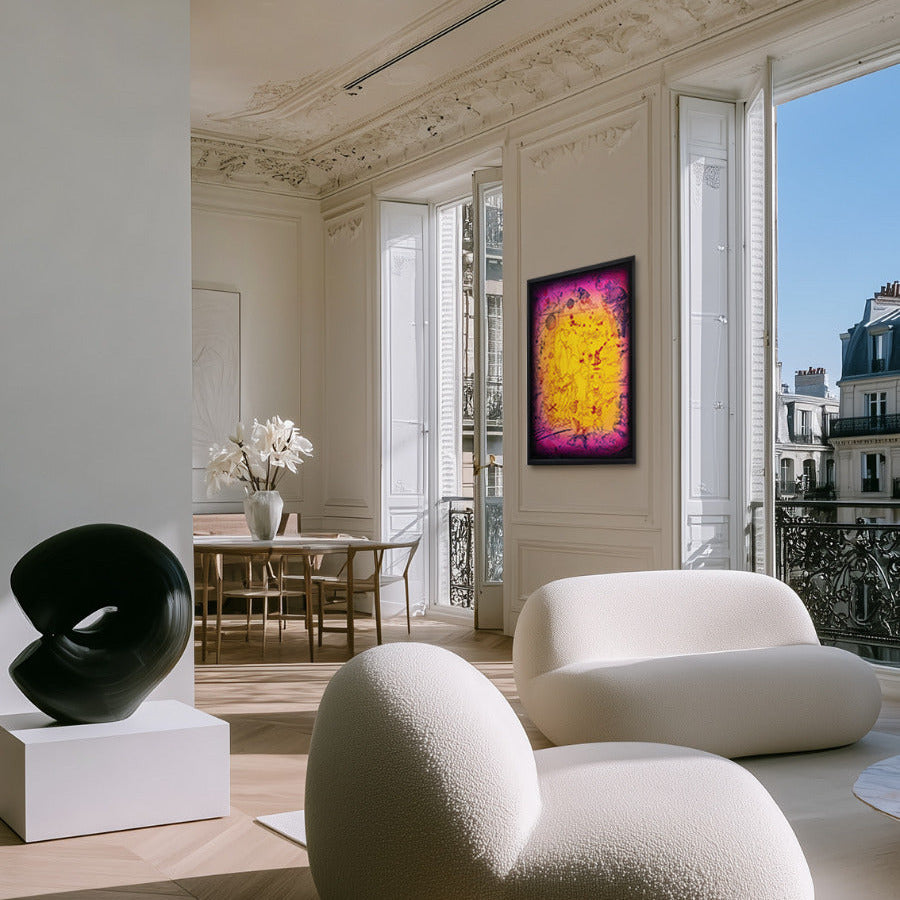 In "Held in Light," a warm, glowing yellow bursts from the center like captured sunlight, melting into rich magentas that feel alive with hidden passion. The colors spill outward, softly fading into deep black edges that frame the piece like a quiet night sky. It's a perfect balance of light and shadow—intense yet inviting, as if the painting is gently breathing warmth into your space.