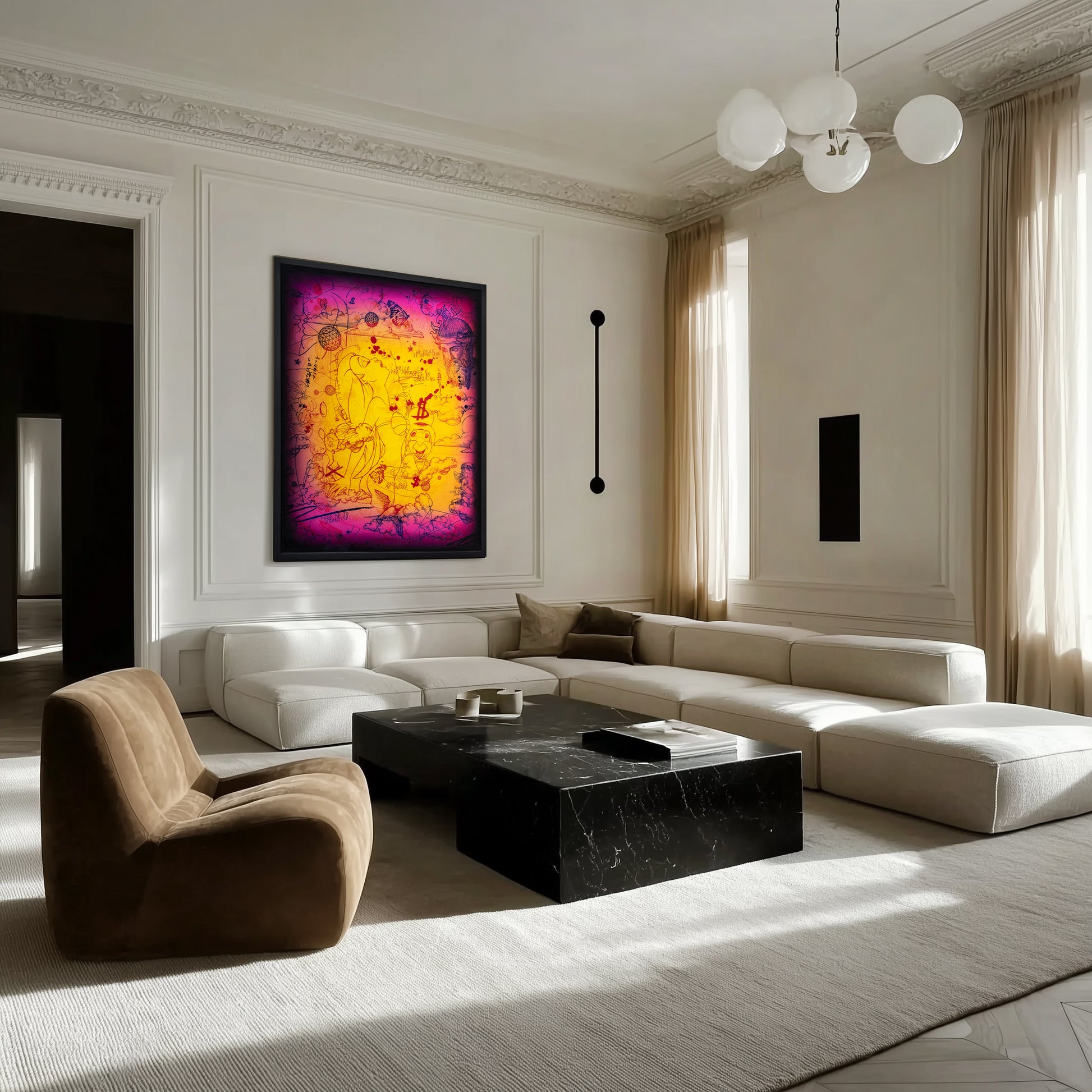 Now compare that to "Held in Light," where warm yellows and rich pinks burst forth like a steamy, blooming garden—full of lively, almost sensual energy. The glowing center seems to breathe, as if the mixed elements are lit from within, pressing against the dark edges like longing held back. But this brightness isn't all smooth joy; the jumbled forms—a limb twisting with a flower pattern, or a potion bottle melting into geometric shapes—keep the rebellious spirit of the Thought Paintings, urging us to blend the physical and the dreamlike. Here, color acts as a symbol for inner emotional layers: it doesn't just enhance the look but reveals deeper feelings, lighting up the tensions hidden in the original's black-and-white limits. The yellows and pinks, warm and inviting like humid air, evoke a paused breath—a instant caught between bliss and fading away, much like the magical potions hinted at in the original title.