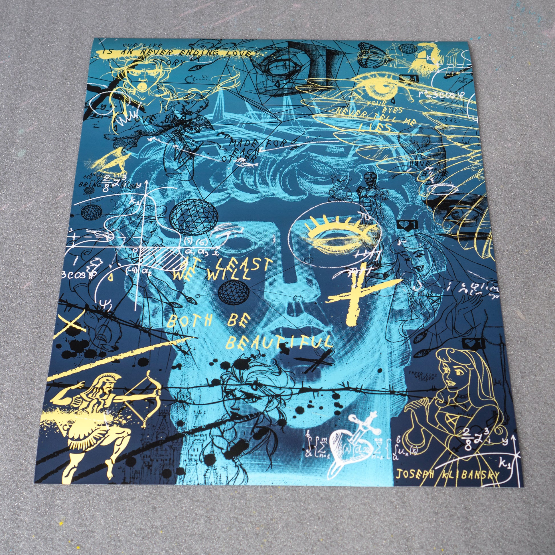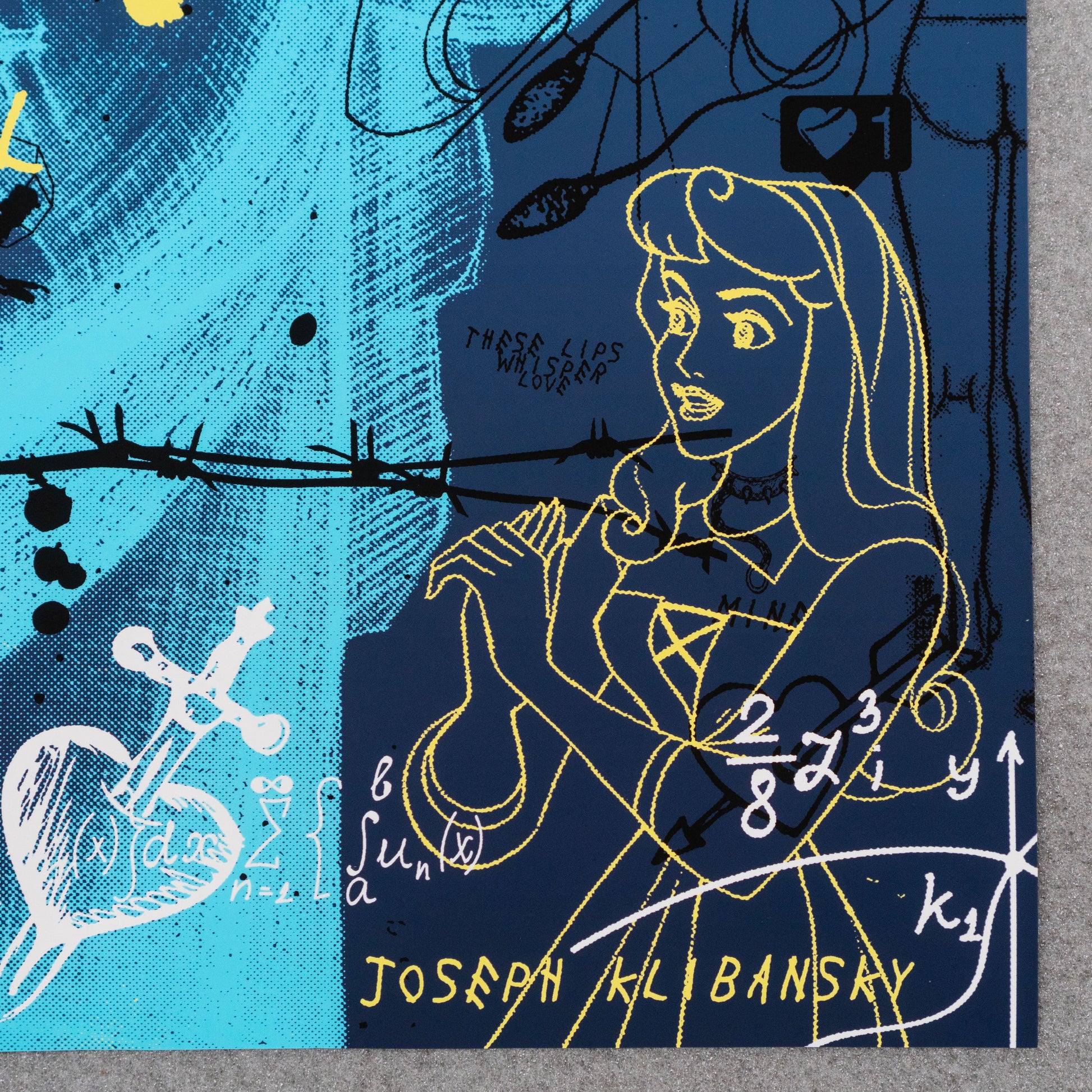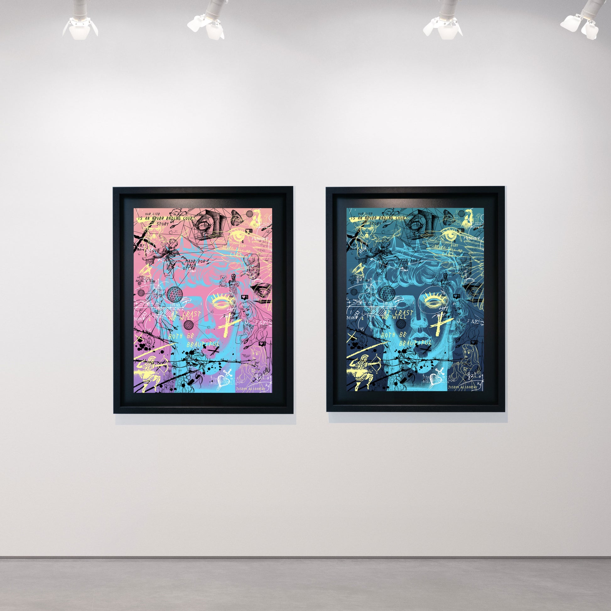 Never Ending Love (blue) is a limited edition giclée fine art print of 50 pieces on 100% archival cotton paper, framed in a black wooden block frame with anti-glare museum glass, float mounted.