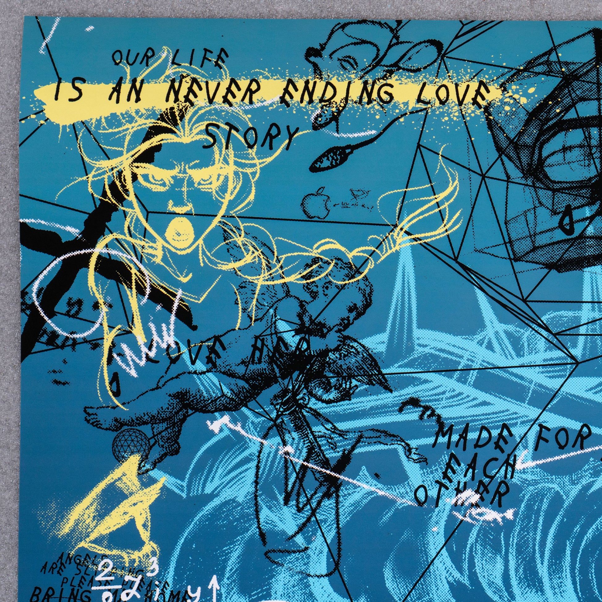 The artwork "Never Ending Love" captivates with its vibrant fusion of electric pinks and soft blues, creating a dreamlike atmosphere that feels both intimate and expansive. The composition is layered with intricate illustrations, splashes of ink, and handwritten stories that explores themes of connection and romance. There is a raw, almost chaotic energy in the piece, yet the bright colors offer a sense of optimism and tenderness.