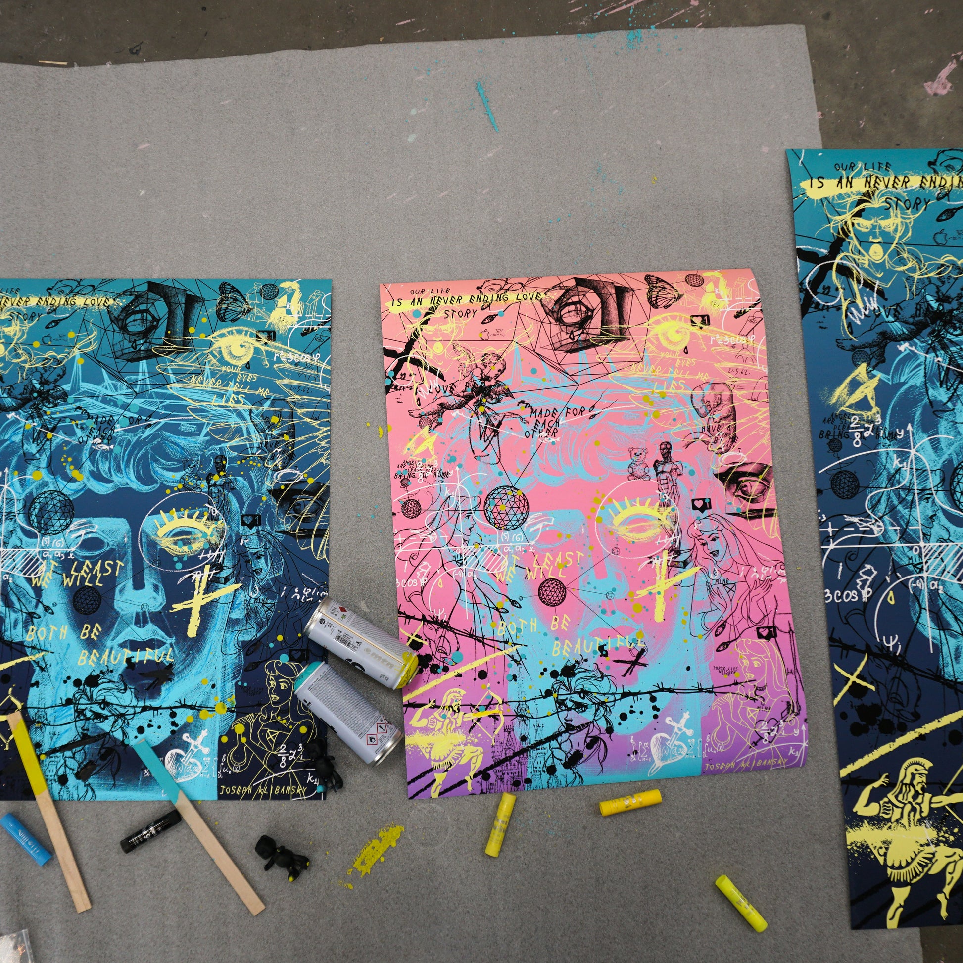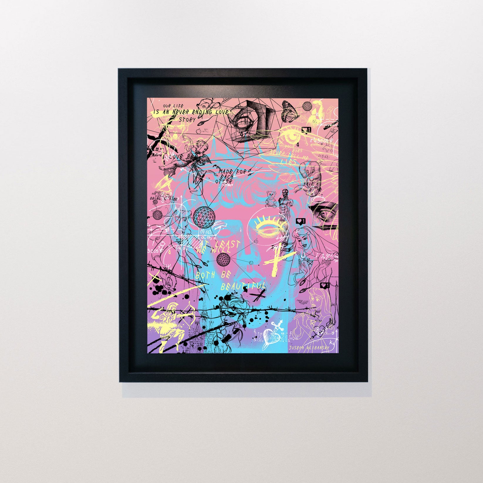 The artwork "Never Ending Love" captivates with its vibrant fusion of electric pinks and soft blues, creating a dreamlike atmosphere that feels both intimate and expansive. The composition is layered with intricate illustrations, splashes of ink, and handwritten stories that explores themes of connection and romance. There is a raw, almost chaotic energy in the piece, yet the bright colors offer a sense of optimism and tenderness.