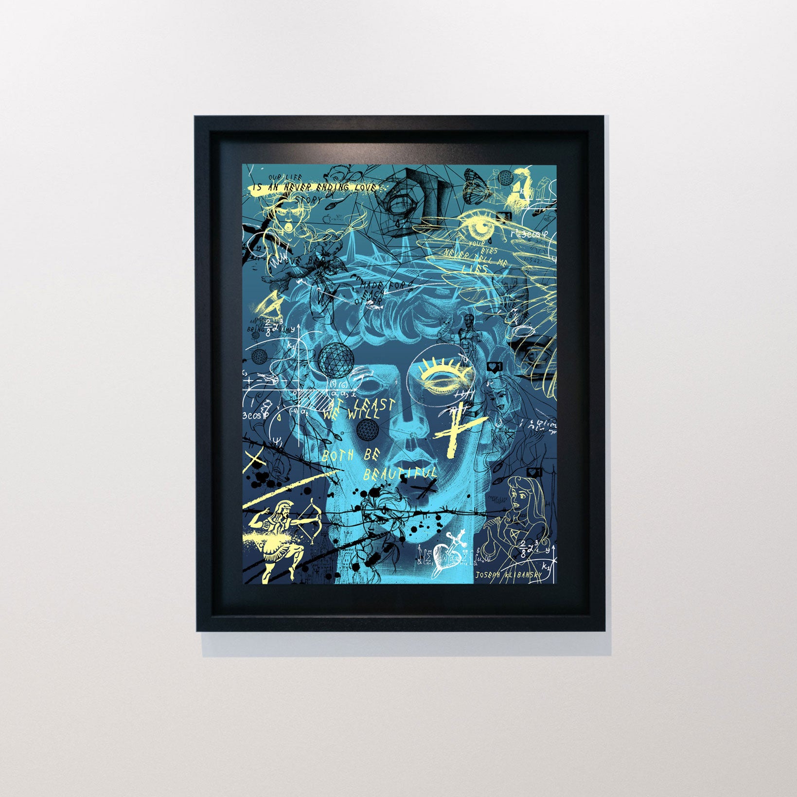 Never Ending Love (blue) - Special Edition is a limited edition giclée fine art print of 20 pieces on 100% archival cotton paper, hand embellished with acrylic paint, framed in a black wooden block frame with anti-glare museum glass.