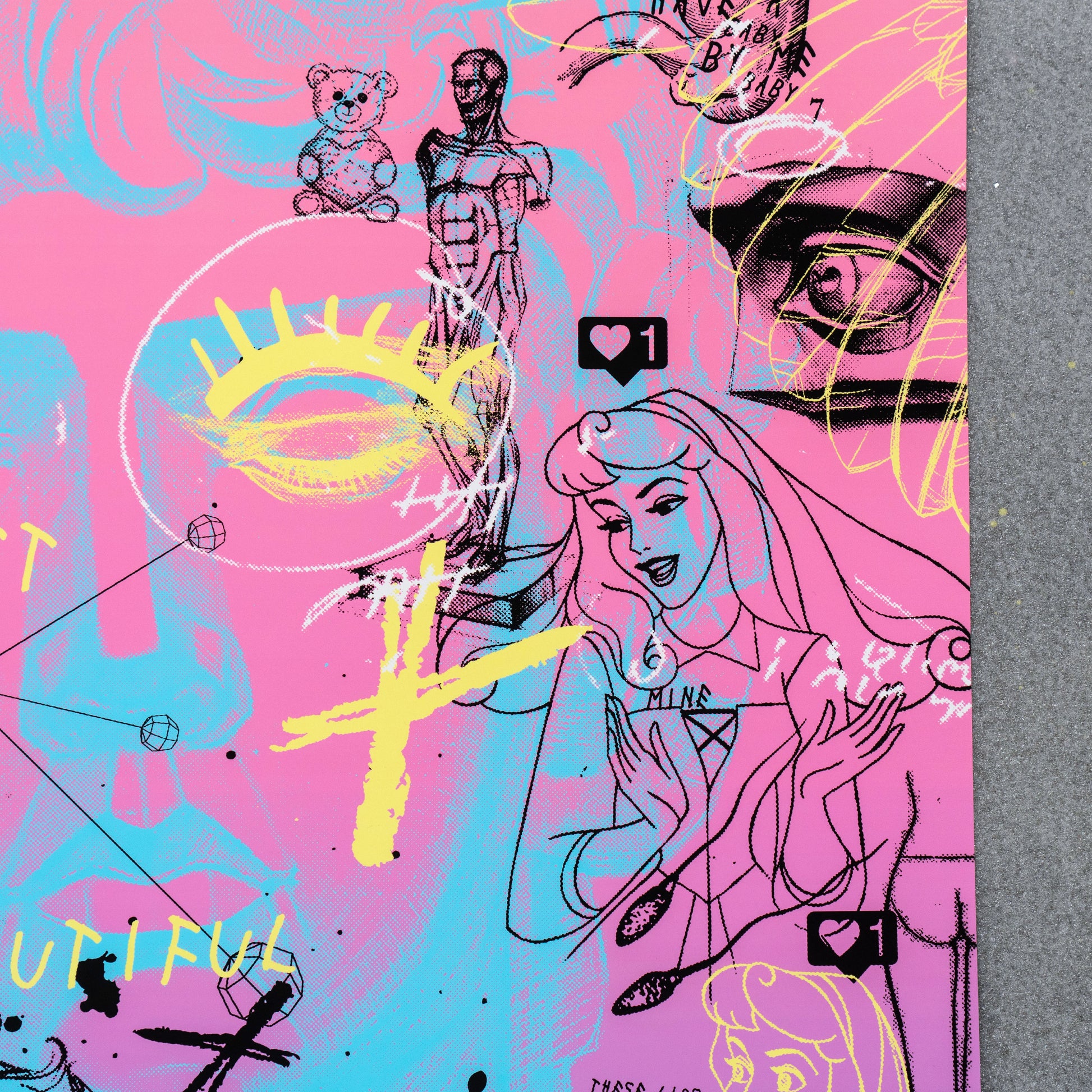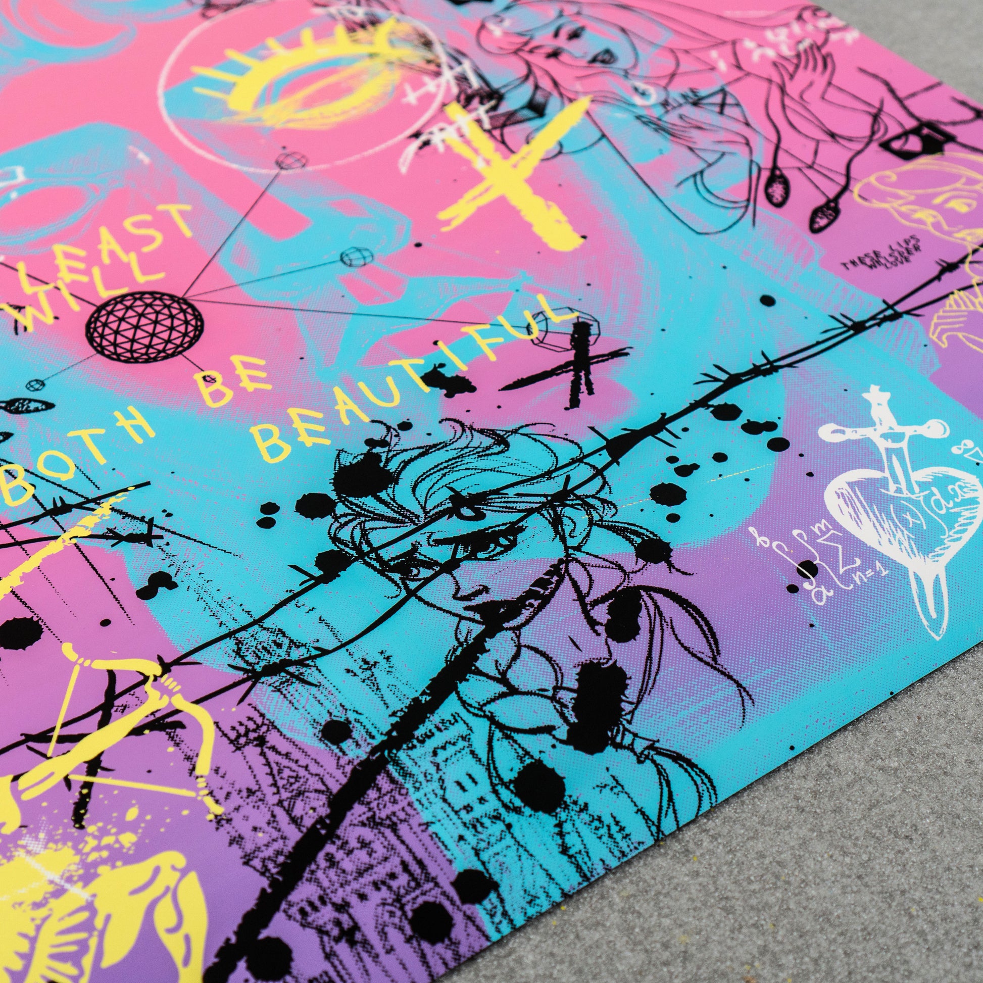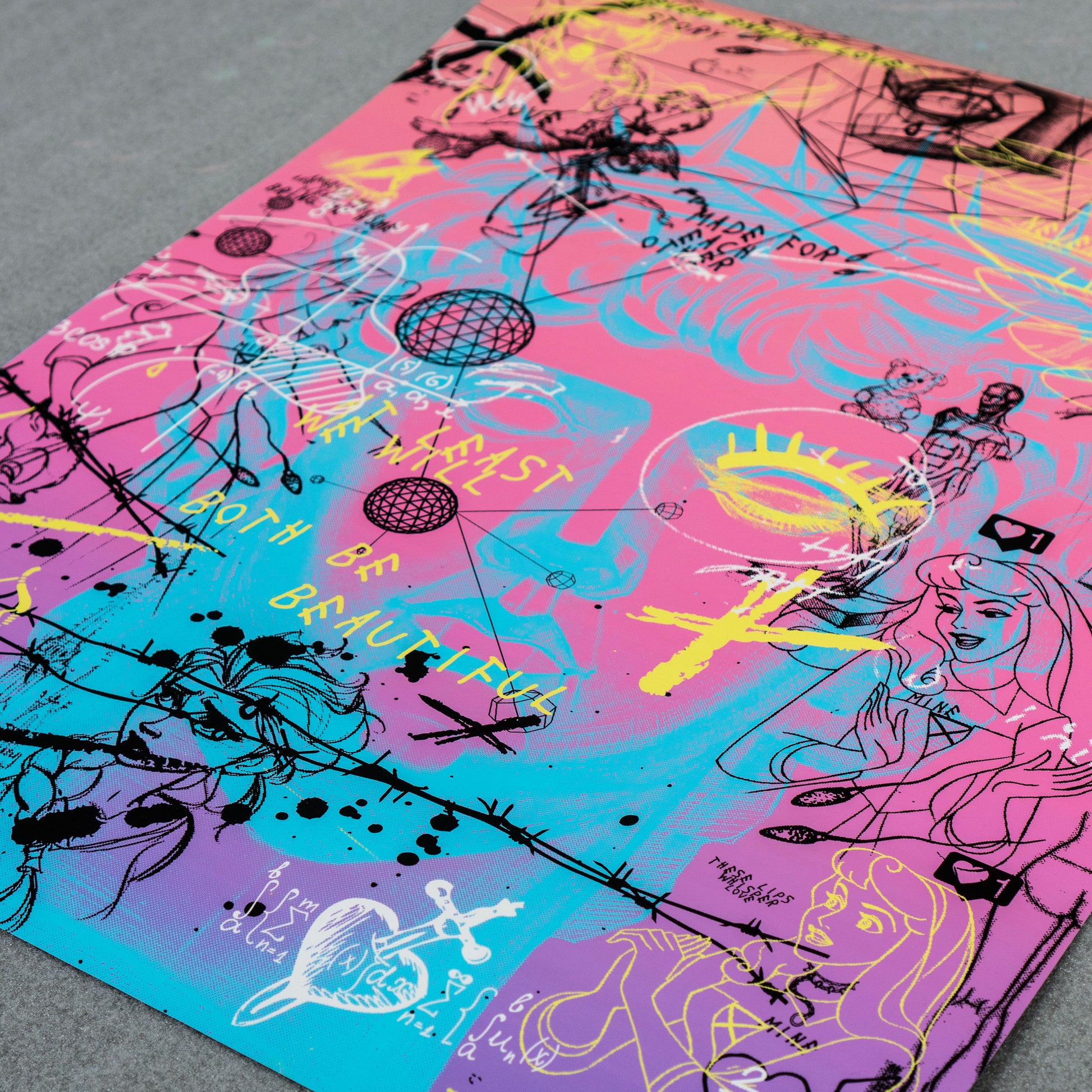 The artwork "Never Ending Love" captivates with its vibrant fusion of electric pinks and soft blues, creating a dreamlike atmosphere that feels both intimate and expansive. The composition is layered with intricate illustrations, splashes of ink, and handwritten stories that explores themes of connection and romance. There is a raw, almost chaotic energy in the piece, yet the bright colors offer a sense of optimism and tenderness.