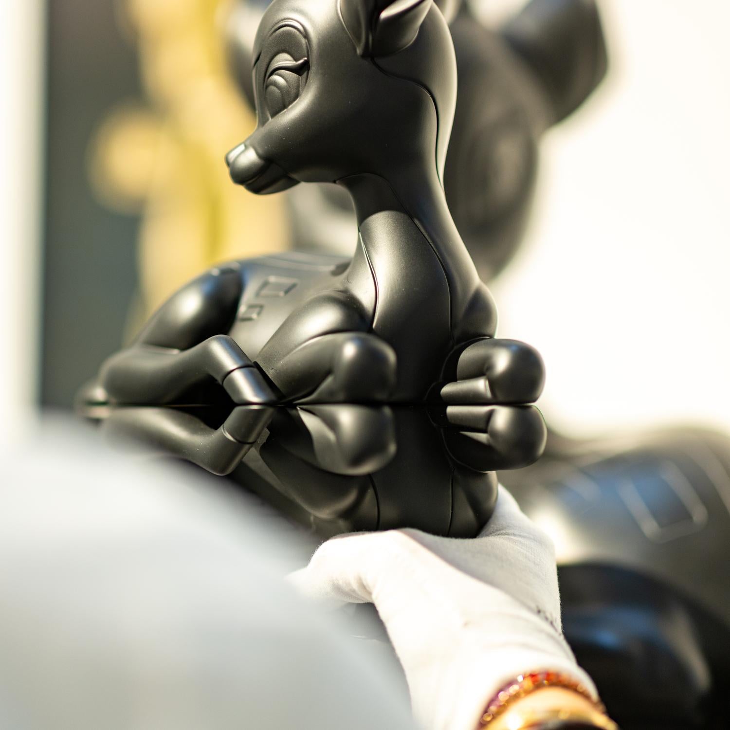 The original bronze Reflections of Youth is a polished bronze sculpture of a young deer, mirrored as if it is sitting on water. This reflection creates a double image, blending the real and the imagined. The deer symbolizes innocence and youth, inspired by the timeless character of Bambi.