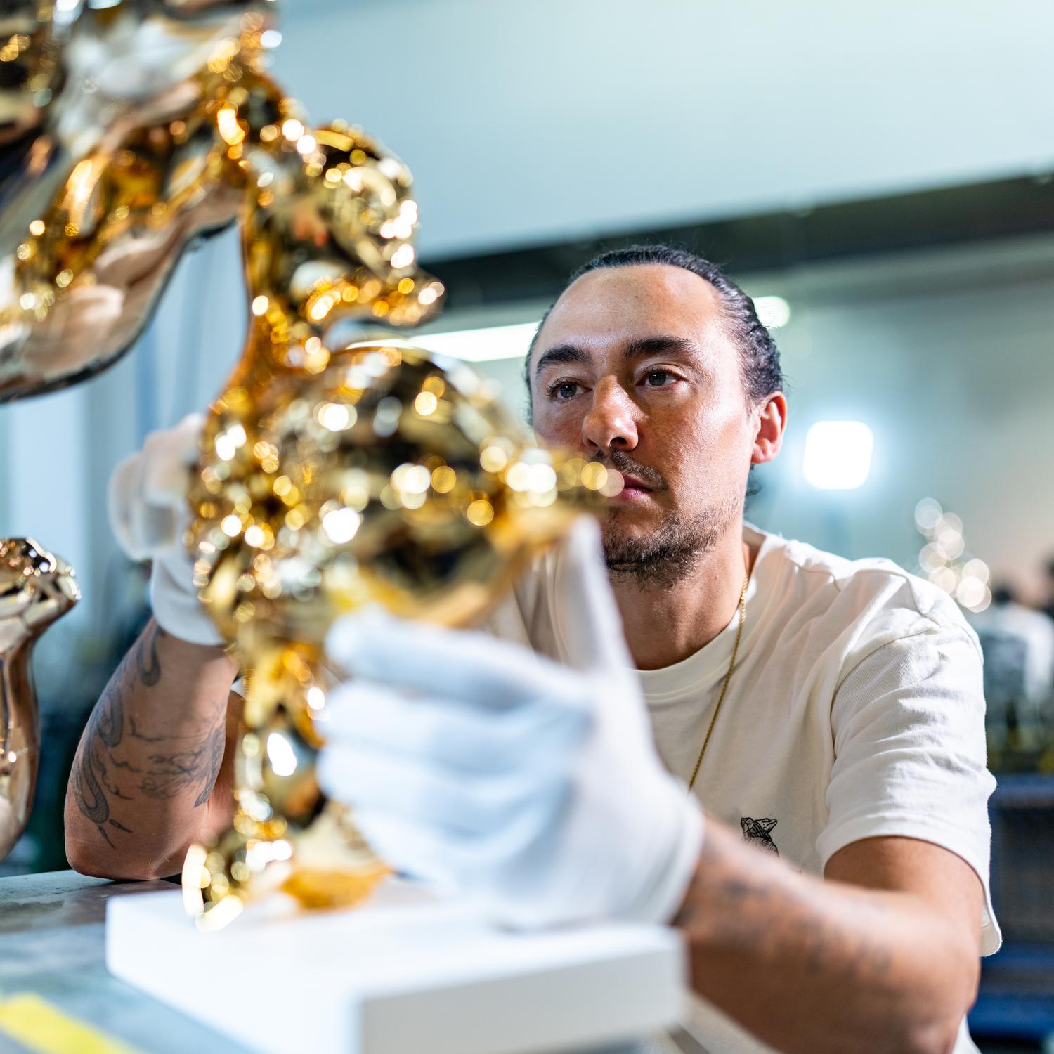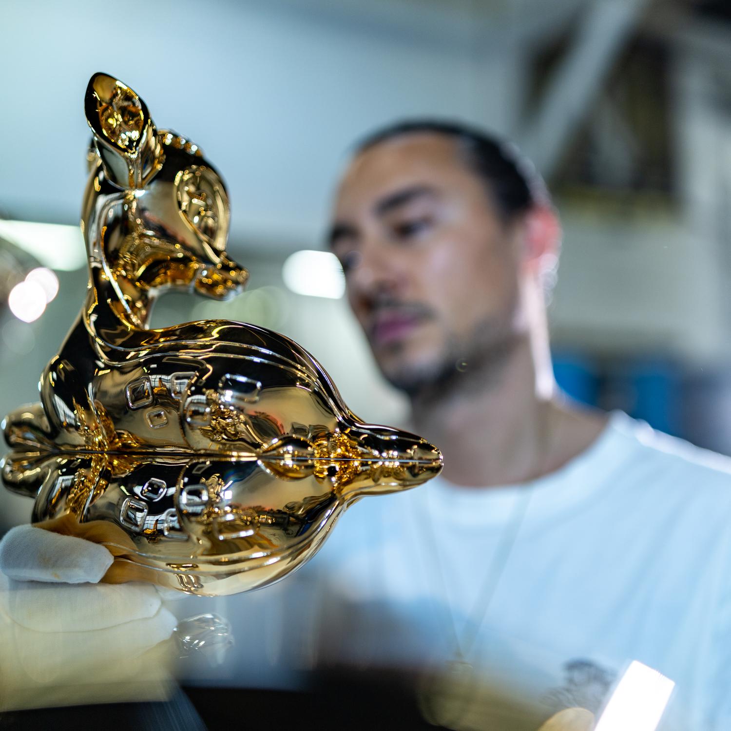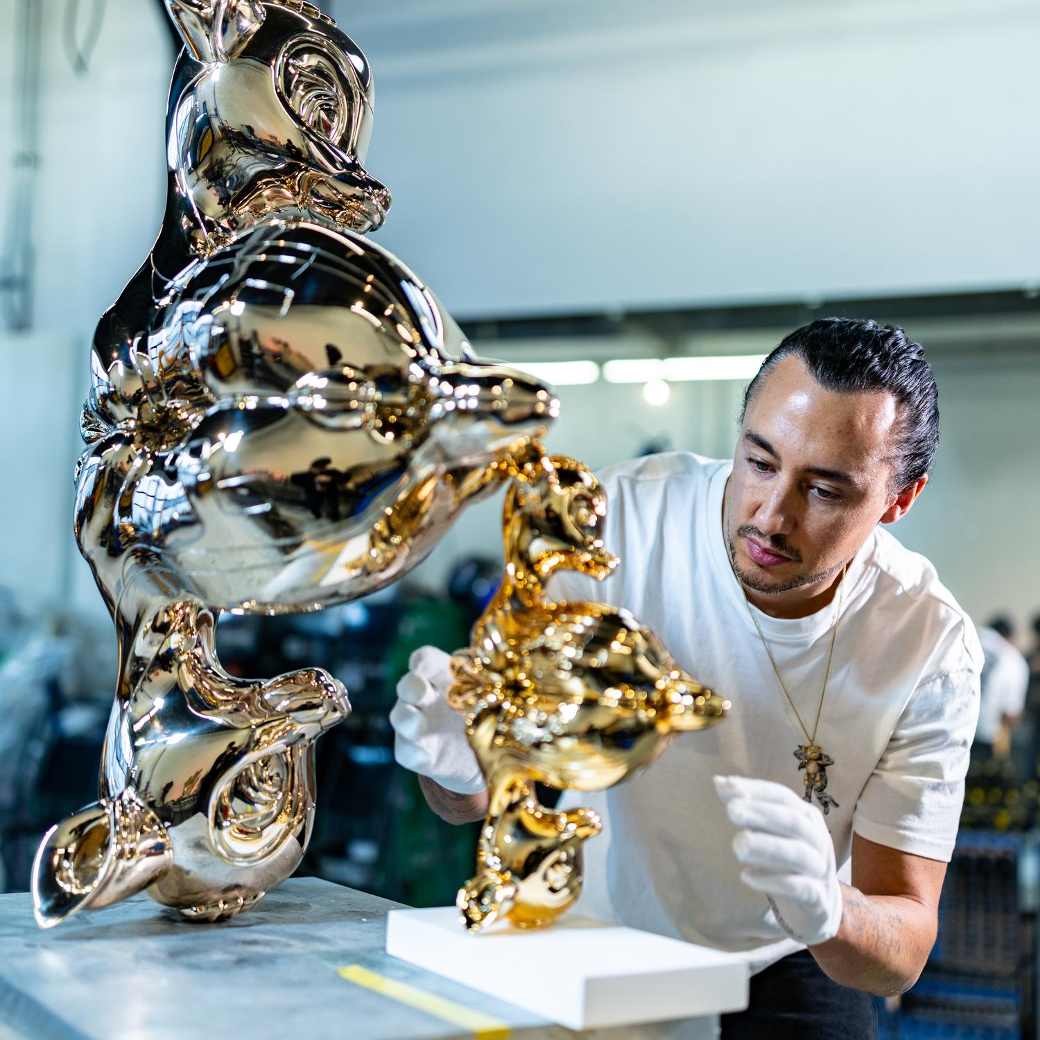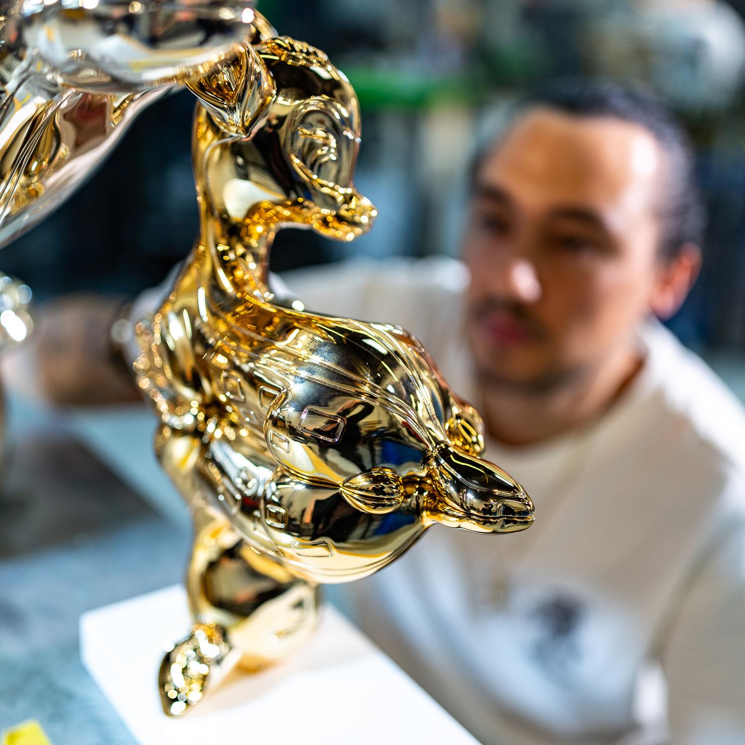 This collectible is meticulously hand-cast in resin and securely connected to its base with a steel pin for durability. To replicate the original’s striking mirror-polished bronze aesthetic, the sculpture is chrome-plated, achieving a similar radiant finish.