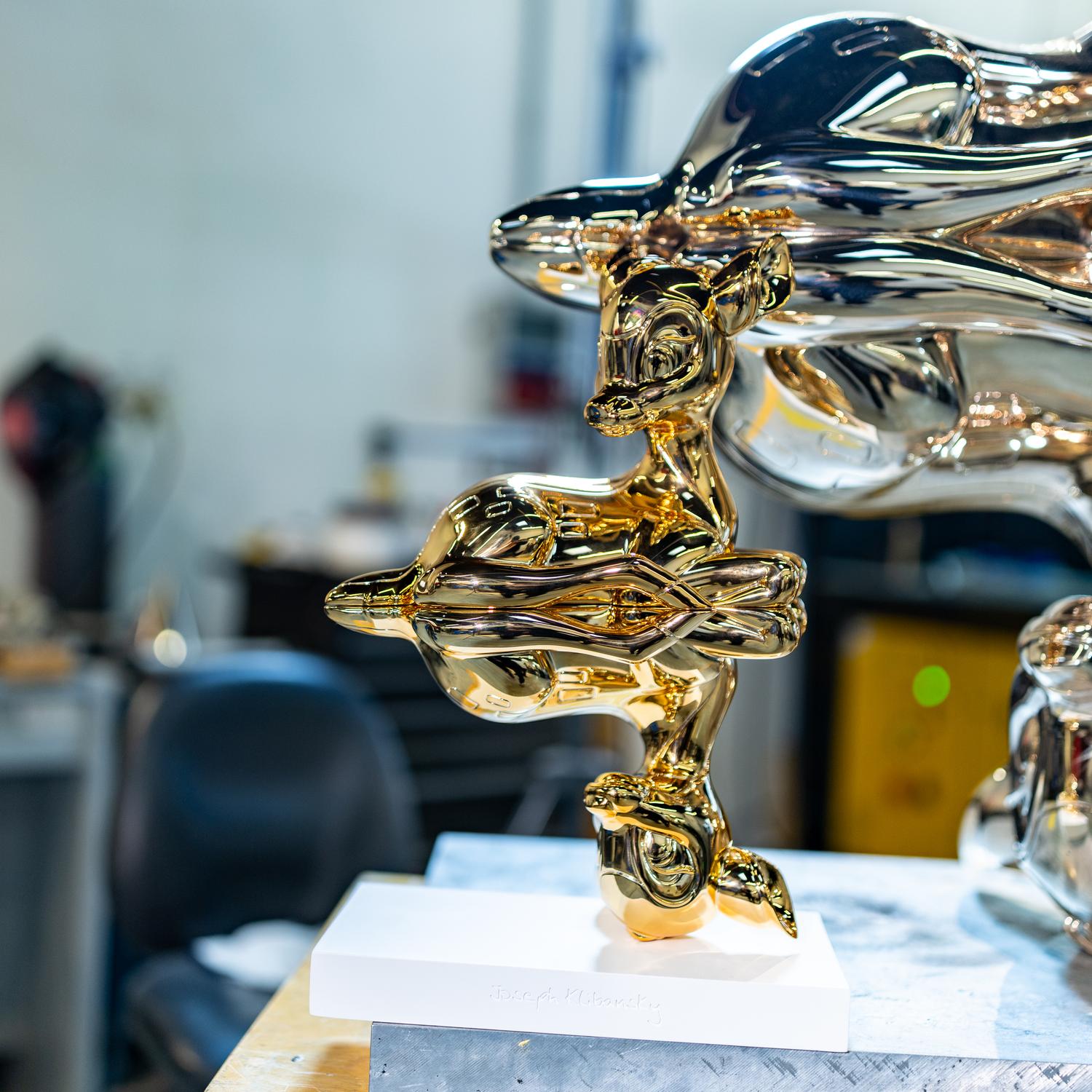 The original bronze Reflections of Youth is a polished bronze sculpture of a young deer, mirrored as if it is sitting on water. This reflection creates a double image, blending the real and the imagined. The deer symbolizes innocence and youth, inspired by the timeless character of Bambi.