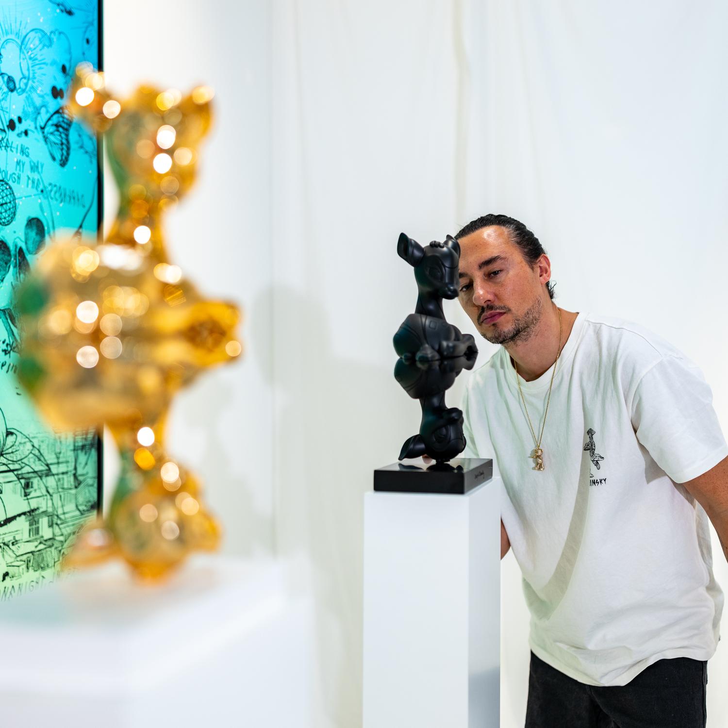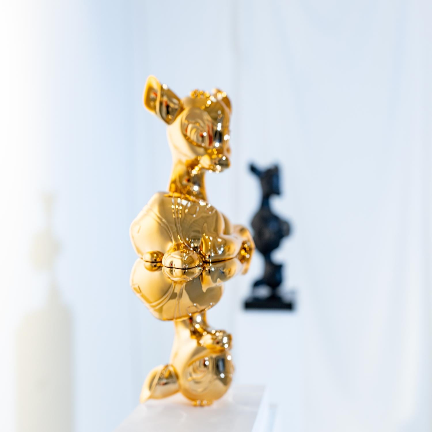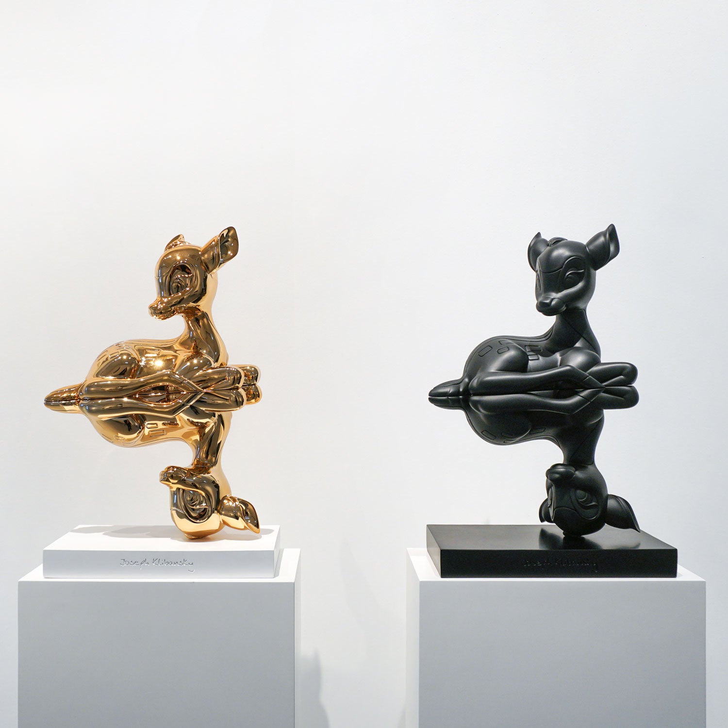 This Art Collectible bundle or Reflections of Youth in Black and Gold, is a stunning miniature version of Joseph Klibansky’s iconic Reflections of Youth sculpture, originally released in 2017 in mirror polished bronze and in 2024 in Belgian black marble.
