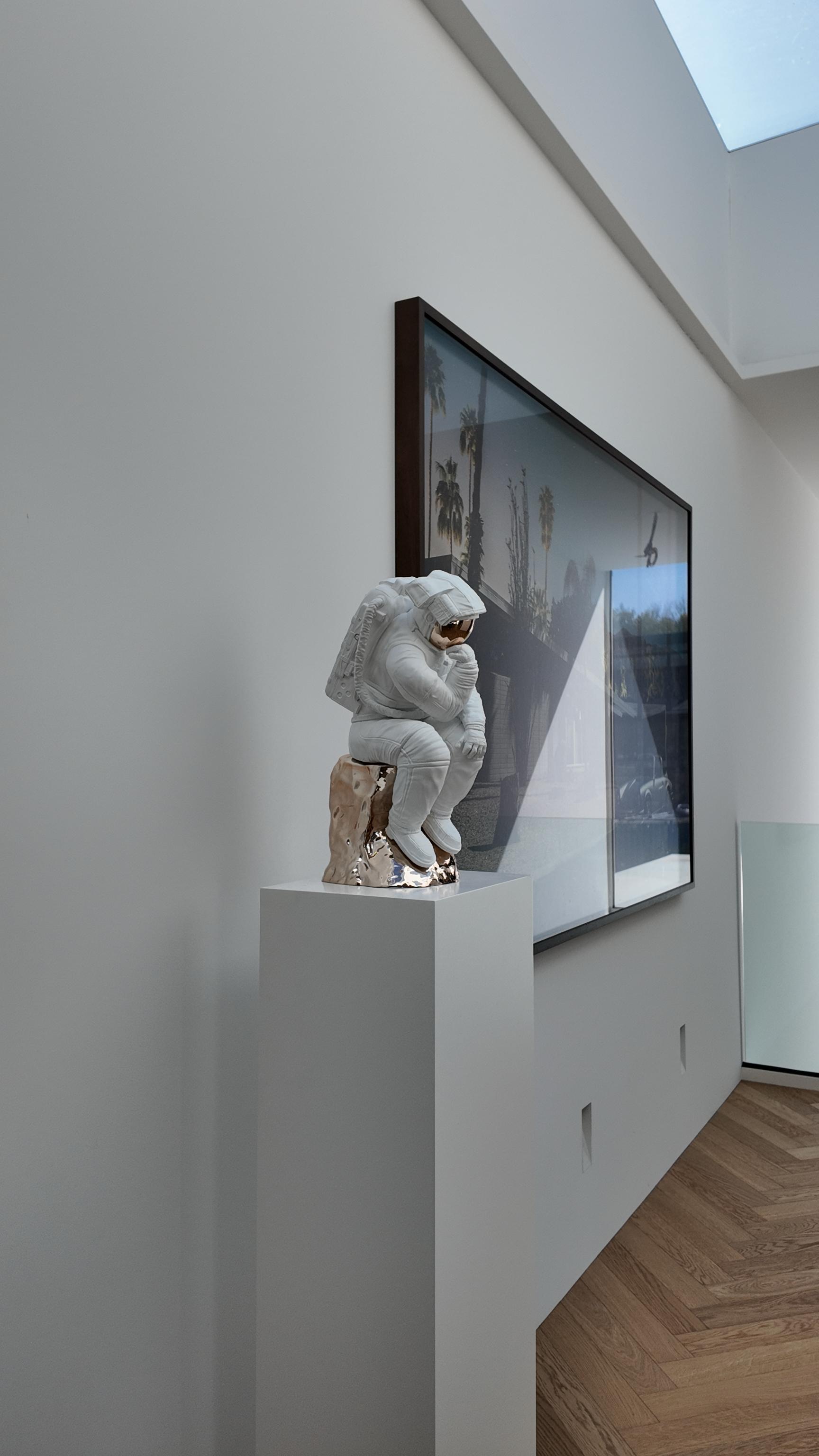 Where Rodin’s sculpture embodied classical philosophy and introspection, this Thinker reflects in the age of artificial intelligence, space exploration, and rapidly shifting ground beneath our feet. Surrounded by the vast unknowns of both cosmos and code, this figure contemplates a different kind of existence—one shaped not only by human reason, but by machines, data, and exponential discovery.
