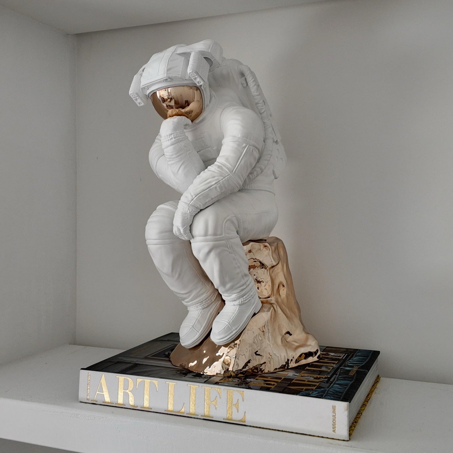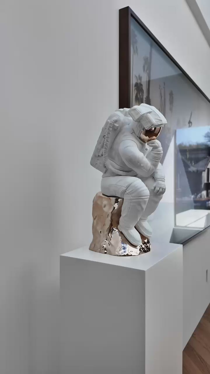 An astronaut sits—frozen in the iconic pose of Rodin’s The Thinker—the rock symbolizing the edge of a new era.