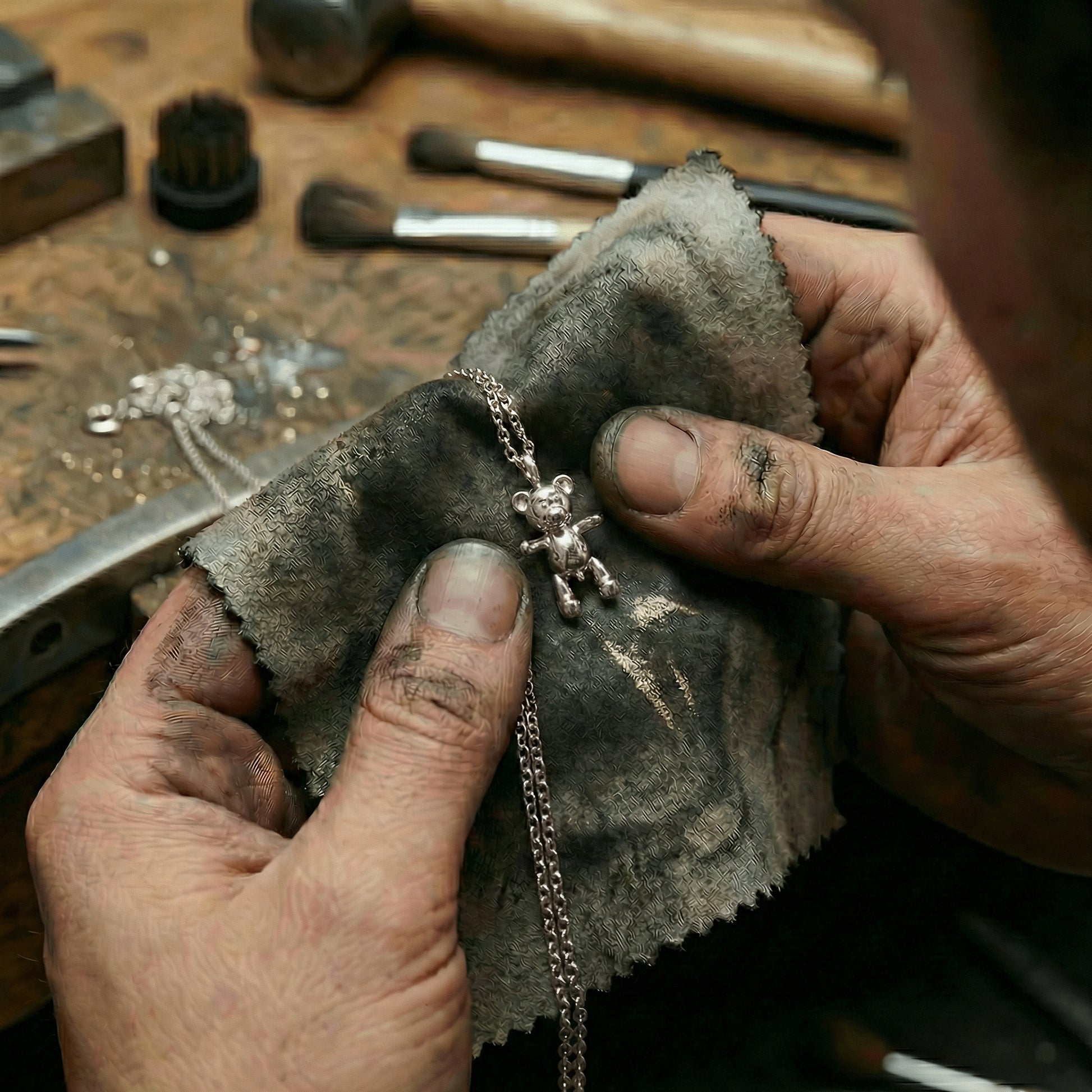 Crafted in 18K gold or 925 Silver depending on the version chosen, this sculptural pendant transforms Joseph Klibansky’s iconic bronze artwork Bare Hug into a refined, wearable form.